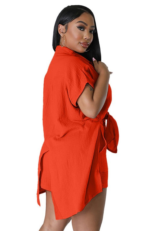 Sexy 2pcs set, short sleeves, front button, elasticized waist shorts with side pocket